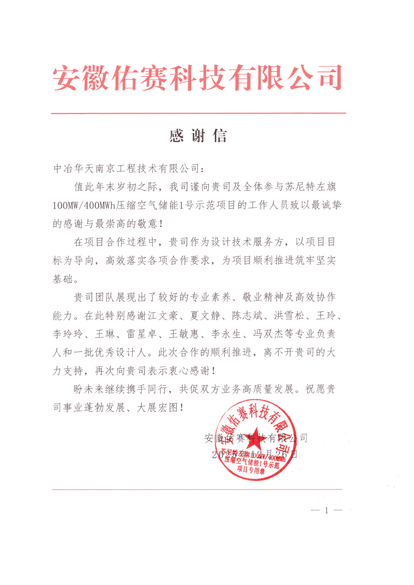 近日,中冶華天收到來自蘇尼特左旗100MW/400MWh壓縮空氣儲能1#示范項目合作方安徽佑賽科技有限公司(簡稱“佑賽科技”)的感謝信,信中對中冶華天在項目合作過程中展現出的專業能力和敬業精神給予高度評價,對設計團隊成員表示衷心感謝,集中展現了公司踐行的高品質履約精神與華天人的向陽風貌。